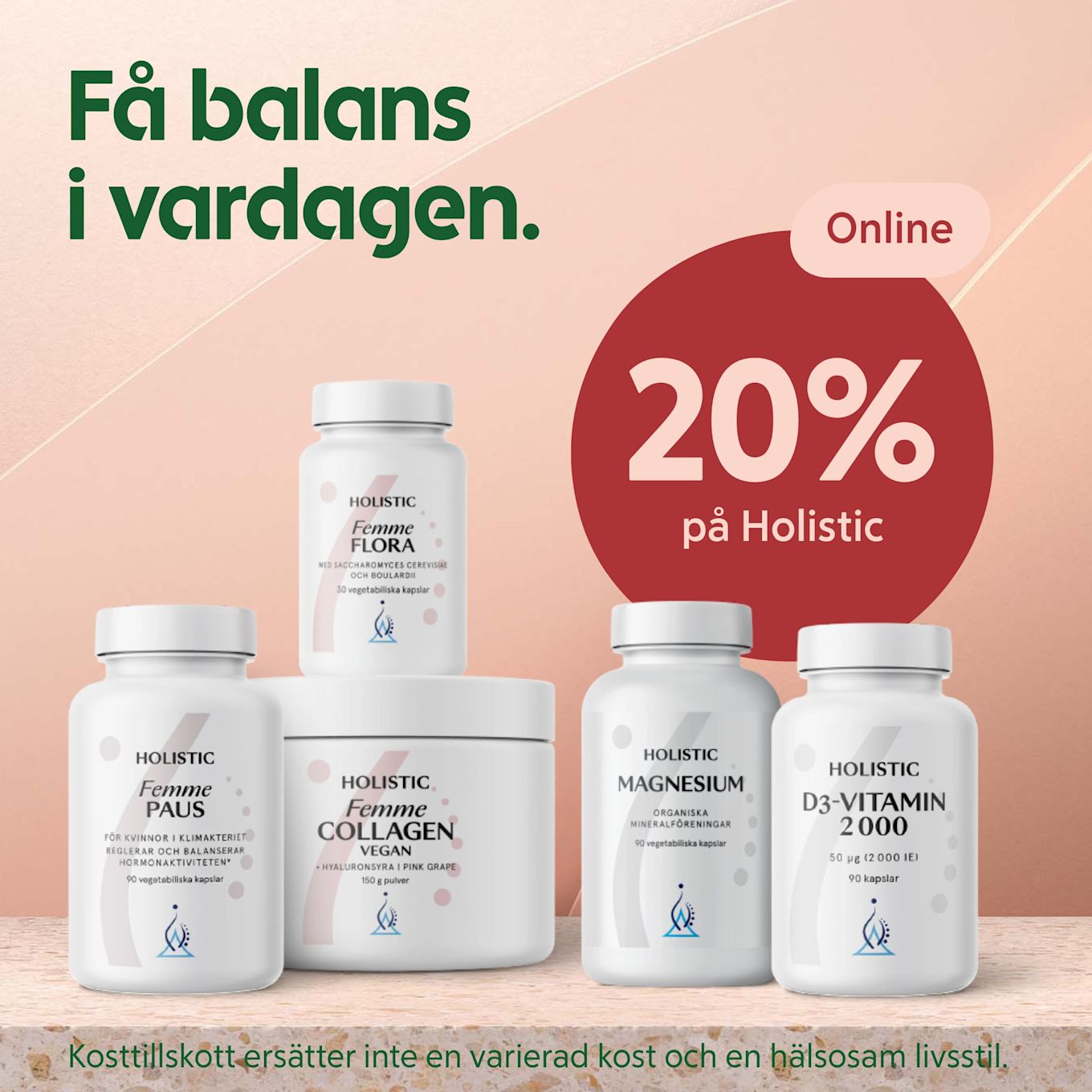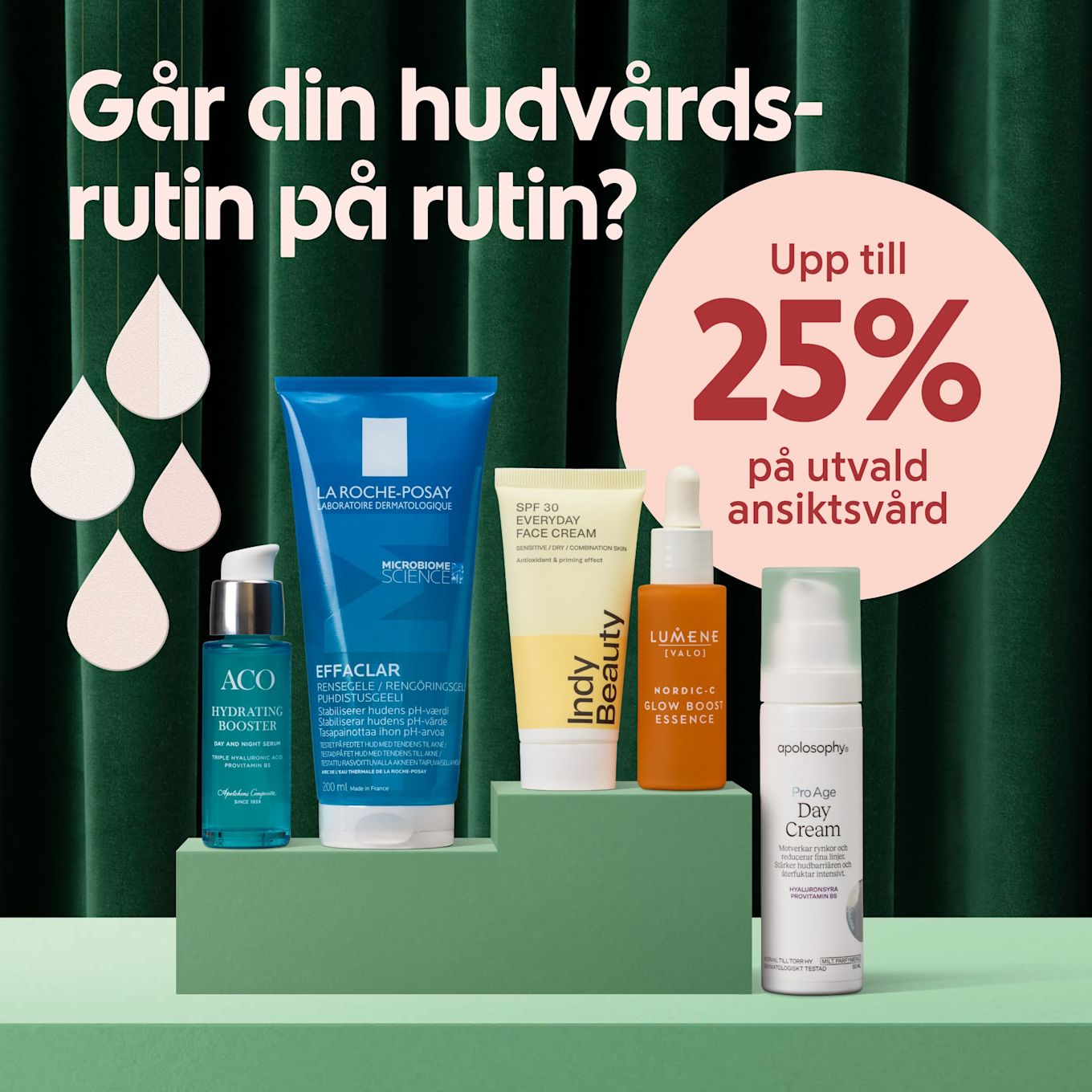 Fyra apolosophy hudvårdsprodukter står mot beige bakgrund med texten 25% Apolosophy och Gäller online i röda cirklar.