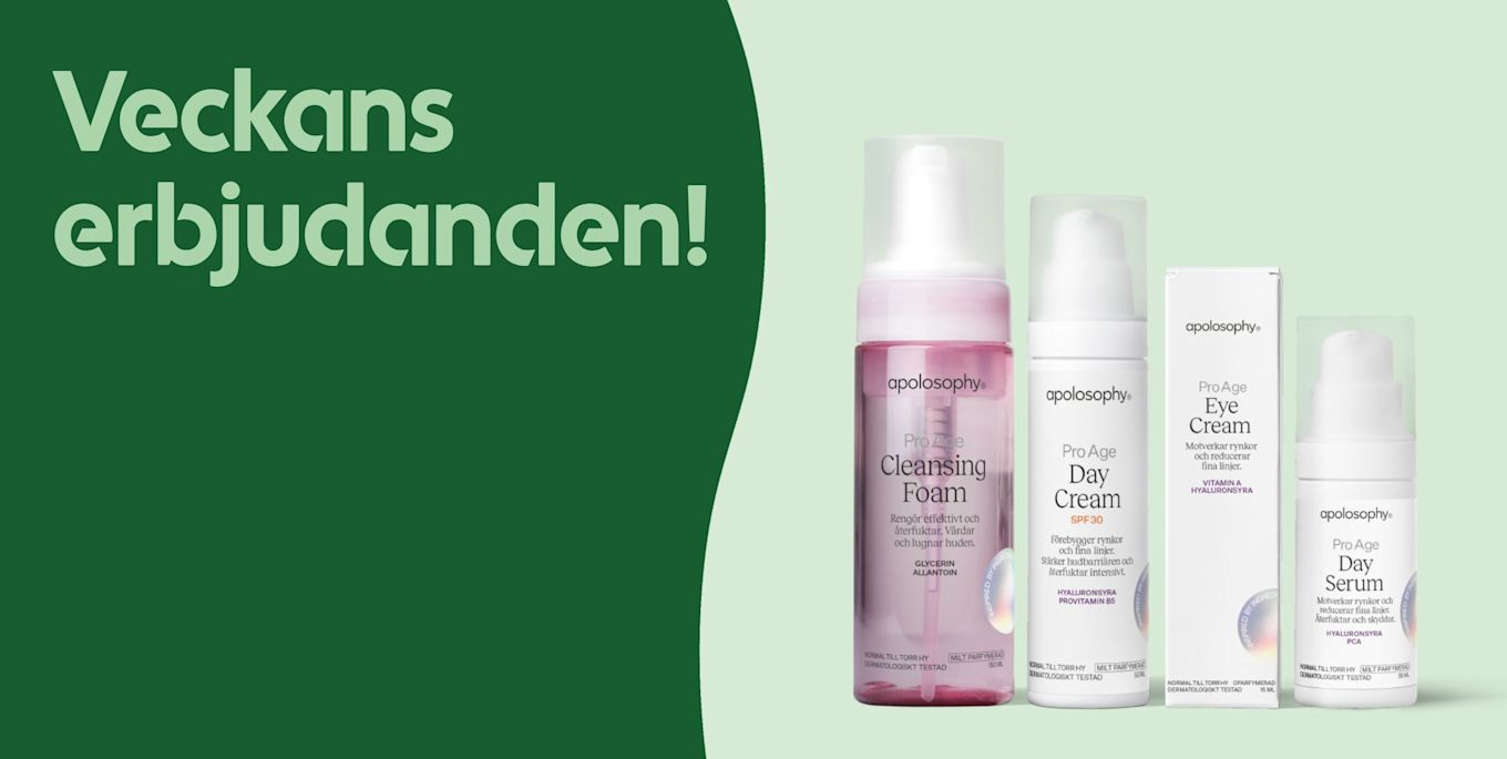 Veckans erbjudanden med hudvårdsprodukter från Apolosophy, ACO och Eucerin mot ljusgrön bakgrund.