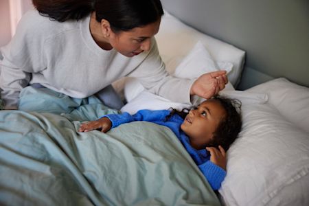 Mamma känner av temperaturen på sitt barn med handen mot barnets panna. Barnet ligger i sängen och kanske har feber och är sjuk.