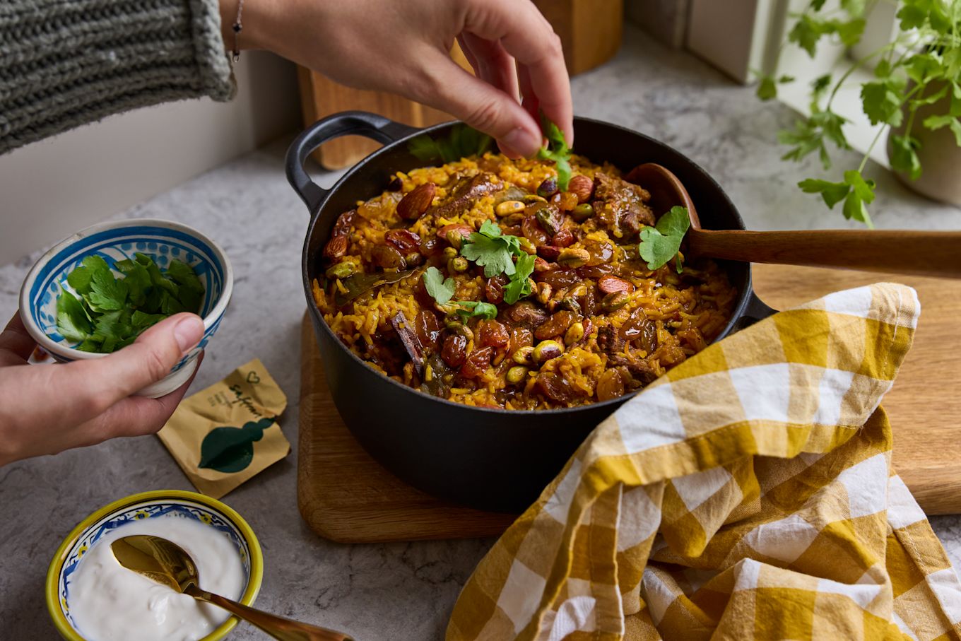 Rör ihop Ghee (smörfett) med rivna morötter i en separat gryta. Tillsätt nötter, russin, lite vatten, saffran och valfria kryddor från receptet. Häll morötterna över lammgrytan innan servering.