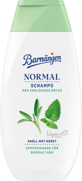 Barnängen Schampo Normal är ett uppfriskande schampo berikat med ekologiska örter. Schampo som är snäll mot håret med vegansk formula för normalt hår. Fräschar upp och stärker håret från rot till topp samt ger en frisk känsla och naturlig volym. Dermatologiskt testad och kan användas dagligen.