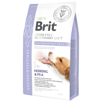 Brit Gluten & Grain-Free Veterinary Diet Dog Gastrointestinal är ett komplett dietfoder för hundar med gastrointestinala problem. Torrfodret ger lindring av akuta intestinala absorptionsstörningar och ger kompensation vid matsmältningsbesvär. Det hjälper till att lugna matsmältningskanalen efter diarré och kräkningar. Fodret innehåller bland annat sill och gula ärtor. 2 kg.