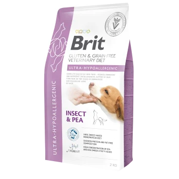 Brit Gluten & Grain-Free Veterinary Diet Dog Ultra-Hypoallergenic är ett spannmålsfritt veterinärfoder för hundar. Fodret hjälper till att ge lindring av hud- och matsmältningssymtom orsakade av foderallergier. Torrfodret är baserat på insekter och minskar intolerans mot ingredienser och näringsämnen. Torrfodret hjälper till att främja hudens funktion vid dermatos och hög pälsfällning. Det bidrar även till minskning av atopiska symtom och dermatologisk klåda samt stärker den naturliga hudbarriären och immunförsvaret. 2 kg.
