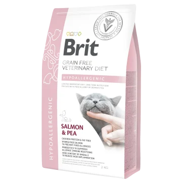 Brit Grain-Free Veterinary Diet Cat Hypoallergenic är ett komplett dietfoder för katter som lider av foderallergier och foderintoleranser. Torrfodret hjälper till att reducera symtom relaterade till intolerans mot ingredienser och näringsämnen. Fodret bidrar till bättre hud- och pälskvalitet och lugnar matsmältningskanalen. Fodret är baserat på lax och gula ärtor. 2 kg.