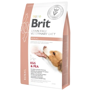 Brit Grain-Free Veterinary Diet Dog Renal är ett komplett dietfoder för hundar som löser upp struvitstenar. Fodret kan bland annat användas vid njurinsufficiens, kardio-renalt syndrom eller urat och cystin urolitiasis. Fodret löser upp och förebygger struvitstenar. Med moderata nivåer av protein och fosfor, samt kontrollerade nivåer av natrium och kalium. Innehåller taurin, arginin, karnitin och antioxidanter. Innehåller även Omega-3, EPA och DHA. Prebiotiskt fiber hjälper till att stödja tarmfloran och minska magbesvär. 2 kg.