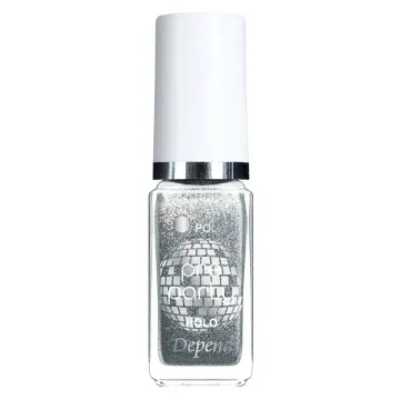 Depend Minilack är ett lättapplicerat nagellack i kompakt format, perfekt när du vill ha många olika nyanser. Specialdesignad pensel som är platt med rundad kant och extra följsam som gör det lätt att applicera. Flaskan är försedd med symboler som visar lackets täckningsgrad; täckande, halvtäckande eller transparent. Detta är nagellack i kollektionen Pre Party, med chrome och holografisk effekt. 5 ml.