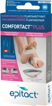 Epitact Comfortact Plus är ett fotskydd som hjälper till att tryckavlasta den främre trampdynan på fötterna och hjälper till att behandla liktornar och förhårdnader. Silikonet i skyddet är utvecklat av fotterapeuter och fungerar som ett substitut för den egna trampdynan. Dynan är mjuk och sprider ut trycket över hela trampdynan för att minska smärta när du går. CE-märkt medicinteknisk produkt. Säljes parvis. Storleksöversikt (skostorlek): Small: 36-38 Medium: 39-41 Large: 42-45