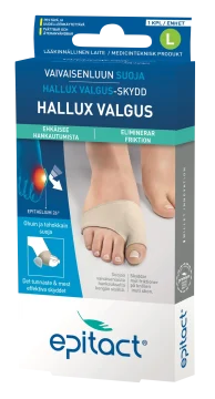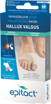 Epitact Hallux Valgus Skydd är ett tunt och effektivt skydd som minskar smärta och skav vid hallux valgus. Skyddet är mycket tunt och passar därför i de flesta typer av skor. Storleksöversikt (skostorlek): Small: 36-38 Medium: 39-41 Large: 42-45