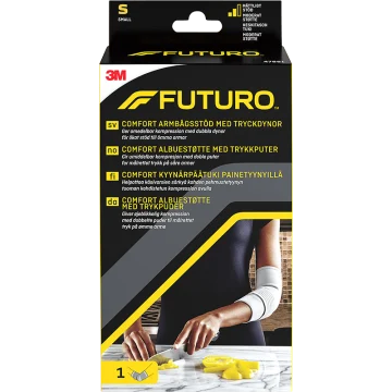 Futuro armbågsstöd är ett smärtstillande armbågsstöd som används vid lindriga ledbesvär i armbåge till följd av förslitning eller överansträngning. Masserande effekt som påskyndar läkningsprocessen. Passar både vänster och höger armbåge. Justerbart band. Finns i storlek small, medium och large. Storleksöversikt: Storlek S (omkrets under armbåge 23,0-25,5 cm) Storlek M (omkrets under armbåge 25,5-28,0 cm) Storlek L (omkrets under armbåge 28,0-30,5 cm)