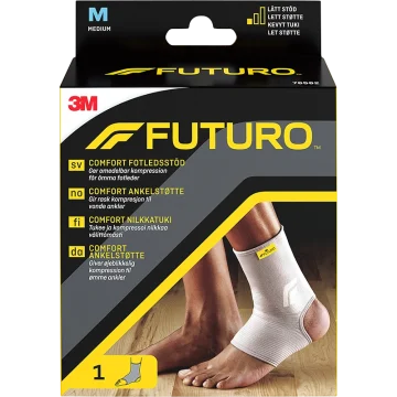 Futuro Comfort Fotled är ett fotledsstöd som kan användas i skor. Det ger stöd till svaga eller stela fotleder. Det stretchiga stickade materialet är mjuk och släpper genom luft. Fotstödet har inga skenor, utan lindrar smärta genom kompression och värme. Det finns i olika storlekar. Storleksöversikt (mät omkretsen runt hälen och ankeln): Small: 25,4-31,8 cm Medium: 31,8-38,0 cm Large: 38,0-44,5 cm