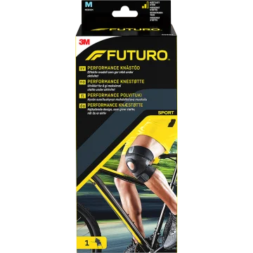 Futuro Performance Knästöd är ett stöd som används vid intensiv och kronisk smärta i knä. Stödet är bekvämt och ger ett stabilt stöd till instabila och överansträngda leder, vid löparknä, korsband- eller meniskskada samt hjälper till att förebygga nya skador vid sport eller annan aktivitet. Det är öppet vid knäskålen för att minska tryck och ge ytterligare stöd. Tillverkat av en neoprenblandning som ger komfort och värme. Materialet på baksidan av stödet släpper igenom luft för att motverka fukt och lukt. Träs enkelt på och dubbla remmar fästs med kardborre. Svart. Finns i tre olika storlekar: Small (omkrets 33,0-38,1 cm), Medium (omkrets 38,1-43,2 cm) och Large(omkrets 43,2-48,3 cm). Mät omkretsen ovanför knät. Passar både vänster och höger knä.