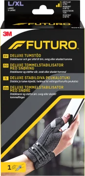 Futuro tumstöd för svaga, smärtande och ömma tummar. Lindrar smärta som uppkommer vid monotona rörelser såsom dataspel eller telefonanvändning. Två stödjande skenor som passar både vänster eller höger tumme. Justerbara kardborreband ger en bra och skön passform. Tillverkad i mjukt och hållbart material som släpper igenom luft och fukt och låter huden andas. Finns i storlek S/M och L/XL. Storleksöversikt: Storlek Small/Medium (tumme 5,0 - 6,3 cm), (handled 12,6 - 17,7 cm). Storlek Large/Extra Large (tumme 6,3- 7,6 cm), (handled 17,7 - 23,0 cm).