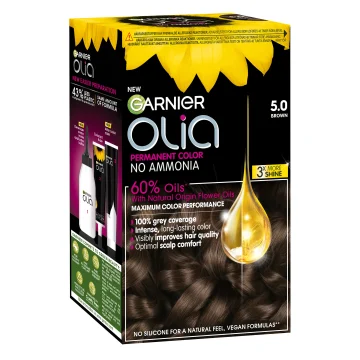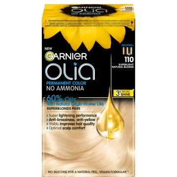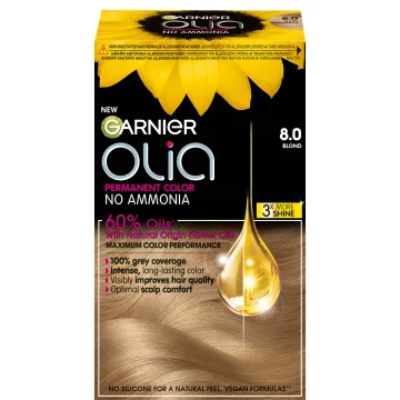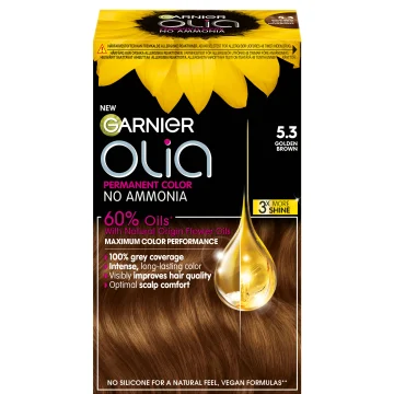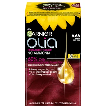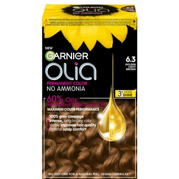 Garnier Olia Permanent Hårfärg är en permanent hårfärg utan ammoniak berikad med 60% oljor för att ge maximal färgprestation och förbättra hårets kvalitet. Ger upp till 100% täckning mot grå hårstrån samtidigt som den är skonsam mot hårbotten. Formulan hjälper till att skapa ett starkt och skinande hår utan att skada håret. 1 pack.