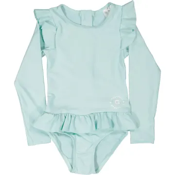 Geggamoja Långärmad UV Baddräkt 50+ Mint är en baddräkt tillverkad i snabbtorkande material med UV-skydd 50+. Långärmad modell som ger extra skydd mot solens farliga UVA- och UVB-strålar. Söt design med volang vid midja och axlar, och praktisk dragkedja i ryggen.