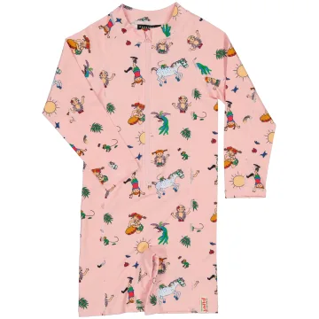 Geggamoja Pippi Långstrump UV-dräkt Rosa är en dräkt med solskydd för barn med långa ärmar, korta ben och ett lekfullt Pippi-motiv. Dräkten är tillverkad i ett snabbtorkande material och har solskyddsfaktor UV 50+, vilket blockerar 98% av solens skadliga strålar. Produkten uppfyller standarden för EN 13758-1.
