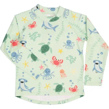 Geggamoja UV-Långärmad Tröja Havsdjur är en UV-tröja med UV50+ som blockerar 98% av solens skadliga UVA- och UVB-strålar. Badtröja som skyddar barnet under de långa dagarna i solen. Gjord i material som andas och torkar snabbt med söt design av havsdjur. Tillverkad i återvunnen polyester.