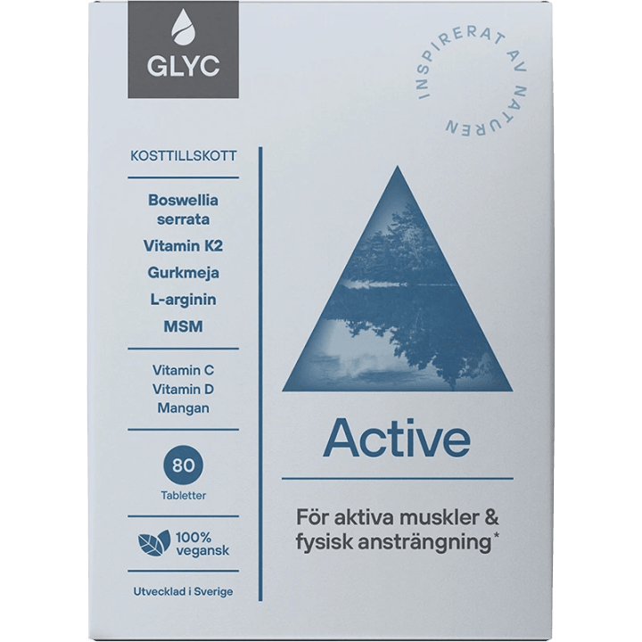 Glyc Active är ett kosttillskott som passar dig som tränar aktivt. GLYC Active innehåller växtextraktet Boswellia serrata, gurkmeja, vitamin K2, mangan och D-vitamin. Gurkmeja bidrar till att upprätthålla och stödja ledernas flexibilitet medan vitamin K2 bidrar till att bibehålla en normal benstomme. Mangan bidrar till normal bildning av bindväv och energiomsättning samt skyddar cellerna mot oxidativ stress. D-vitamin hjälper till att upprätthålla normal muskelfunktion. 80 tabletter.