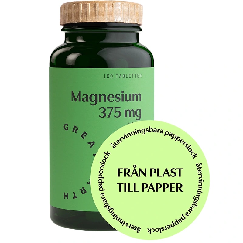 Great Earth Magnesium är ett kosttillskott med magnesium. Magnesium kan bidra till att minska trötthet och utmattning samt till en normal benstomme, en normal muskelfunktion och en normal energiomsättning. Magnesium 375 mg är utformad med Great Earth’s mineraltransportsystem Portamins. Portamins består av lättlösliga och lättupptagliga mineralformer som citrat, glukonat, askorbat, malat, succinat och aminosyrakelat. Aminosyrorna hjälper till att transportera mineralerna in i cellerna. Great Earth Magnesium är även berikat med gurkmejaextrakt, vitamin B6 och svartpepparextrakt. 1 tablett dagligen. 100 tabletter per förpackning.