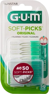 GUM Soft-Picks Original är en mjuk och behaglig tandsticka och mellanrumsborste med tillsatt fluor. Avlägsnar effektivt plack och matrester där en vanlig tandborste inte kommer åt. Masserar och stimulerar skonsamt det känsliga tandköttet. Ett perfekt komplement till den vanliga tandborstningen. Storlek Regular/Medium. Finns i 50 eller 100/pack.