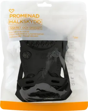 Hjärtats Halkskydd Promenad är diskreta och smidiga helfotsskydd i naturgummi. Med effektiva dubbar under fotblad och häl ger ett bra fäste på snö och is. Halkskydden är enkla att ta av och på, även på stående fot. Dubbarna består av POM och Tungstenkarbid. Tungstenkarbid är ca 35% hårdare än stål vilket ger en unik slitstyrka med en längre livslängd. Undvik användning på barmark för att minska slitage. Tänk på att de kan bli hala på sten eller metallytor. Passar alla typer av skor, enkla att ta på och av även på stående fot. CE märkt och godkänt som personlig skyddsutrustning. Storleksanvisning: S: 35-37 M: 38-40 L: 41-43 XL: 44<