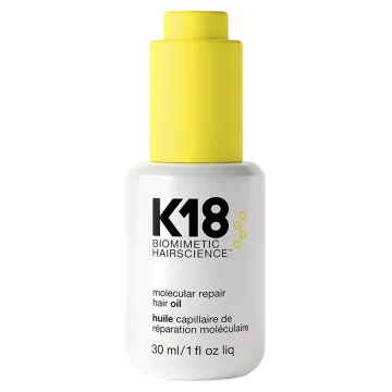 K18 Molecular Repair Hair Oil är en vårdande hårolja som motverkar frissighet, skyddar håret mot yttre påfrestningar och bidrar till att stärka och jämna ut hårstråna. Håroljan är berikad med K18Peptide, en patenterad bioaktiv peptid som hjälper till att återställa hår som skadats av värmeverktyg, UV-strålar, blekning, färgning, mekanisk påverkan, frekvent tvätt och miljöföroreningar. Den innehåller även solrosolja, squalane och hemisqualane som hjälper till att stärka hårets naturliga fuktbarriär för ökad glans och minskad frissighet, samt avokadoolja som ger ett effektivt värmeskydd upp till 230°C på torrt hår. Den vårdande formulan verkar på hårets yta och bidrar till att jämna ut fjällskiktet, mjuka upp hårstråna och kan både förebygga och behandla kluvna hårtoppar. Med en fräsch blomdoft. Passar alla hårtyper.