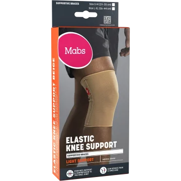 Mabs Elastiskt Knäbandage Beige är ett stödjande knäbandage i elastiskt material. Ger stöd, kompression och avlastning för knäleden, samt har en lätt värmande effekt. Kan användas vid smärttillstånd i knäleden, lättare instabilitet, ledförslitning och vid muskelinflammation. Beige färg.