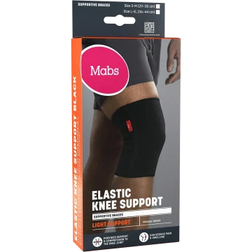 Mabs Elastiskt Knäbandage Svart är ett stödjande knäbandage i elastiskt material. Ger stöd, kompression och avlastning för knäleden, samt har en lätt värmande effekt. Kan användas vid smärttillstånd i knäleden, lättare instabilitet, ledförslitning och vid muskelinflammation. Svart färg.