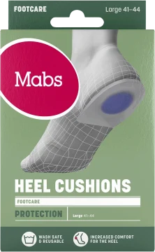 Mabs Heel cushions är stötdämpande hälinlägg som ger ökad komfort för dig som står och går mycket. Tillverkade av 100% silikon som är bekvämt att gå på och har stötdämpande egenskaper. De kan återanvändas och handtvättas med ljummet vatten och tvål. Innehåller 2 st hälinlägg.