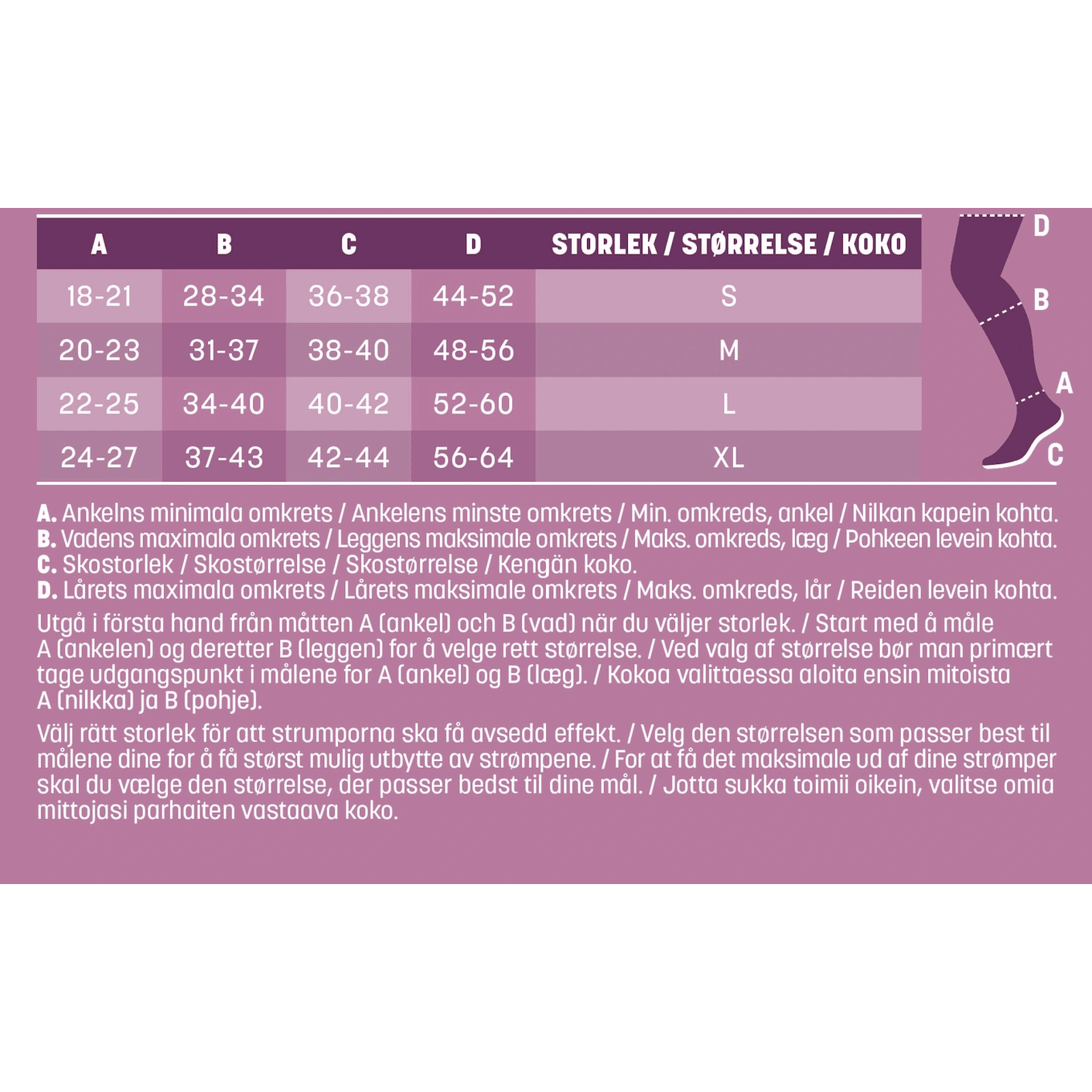 Mabs Nylon Stay Up är en snygga och eleganta stödstrumpor i stay-up-modell. Passar perfekt att använda till klänning eller kjol både till vardags och till fest. Stickad i slät stickning som ger en snygg finish och en skön passform. Nylonstrumporna motverkar svullnad i benen utan att kompromissa med stilen på kontoret, på fritiden eller på festen. Strumporna når en bit upp på låret och har en elegant spetskant med dubbla silikonränder som gör att de sitter väl på plats. Stickade i en bekvämt nylonmaterial som motsvarar 140 denier och har kompressionsklass 1 (15–21 mmHg) som ger god komfort och ett bra stöd i vardagen. Vid långvarigt stillasittande eller stående kan benen och fötterna bli svullna och kännas tunga, spända och trötta. Även graviditet, övervikt och flygresor kan orsaka svullna fötter och ben. Genom att använda en kompressionsstrumpa ökar blodflödet i benen så att de känns pigga och starka hela dagen, oavsett du står går eller sitter mycket. Strumporna hjälper även till att motverka åderbråck. 1 par. Medicinteknisk produkt, läs bipacksedeln noga innan användning. Medicinska kompressionsstrumpor erbjuder kompressionsterapi med medicinsk kompression klass I som har en vetenskapligt bevisad effekt. För att välja rätt storlek och för att passformen ska bli perfekt finns det fyra mått att utgå från: 1) Omkretsen runt ankeln där den är som smalast (A). 2) Omkretsen runt vaden där den är som bredast (B). 3) Din skostorlek (C). 4) Lårets maximala omfång (D). Storleksöversikt: • Storlek S: Omfång ankel: 18-21 cm (A), Omfång vad: 28-34 cm (B), Skostorlek: 36-38 ( C), Lårets max omf: 44-55(D), Strumpans längd: 60 cm • Storlek M: Omfång ankel: 20-23 cm (A), Omfång vad: 31-37 cm (B), Skostorlek: 38-40 ( C),Lårets max omf: 48-56(D) Strumpans längd: 62 cm • Storlek L: Omfång ankel: 22-25 cm (A), Omfång vad: 34-40 cm (B), Skostorlek: 40-42( C), Lårets max omf: 52-60(D) Strumpans längd: 64 cm • Storlek XL : Omfång ankel: 24-27 cm (A), Omfång vad: 37-43 cm (B), Skostorlek: 42-44( C), Lårets max omf: 56-64(D), Strumpans längd: 66 cm