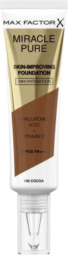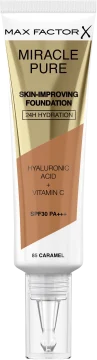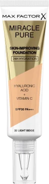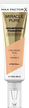 Max Factor Miracle Pure Foundation är en återfuktande foundation med smink och hudvård i ett. Vårdande foundation med uppbyggande nyanser och medium täckning vars ingredienser verkar för att ge huden lyster, fyllighet samt elasticitet för en smidig och fast hud. Formula berikad med vitamin C och hyaluronsyra samt skyddande SPF 30. Återfuktar huden i upp till 24 timmar, kliniskt dokumenterad och dermatologiskt testad.