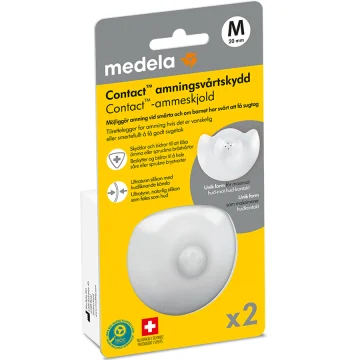 Medela Contact Amningsvårtskydd är skydd för såriga och spruckna bröstvårtor. Tillverkade i extra tunn och mjuk silikon som är smak-och luktfri. Speciell form ger maximal hudkontakt mellan mamma och barn under amningen. Med en hygienisk förvaringsask som gör skydden lätta att ta med. Contact finns i storlek S, M och L. 2 st. Observera att storlek S endast bör användas efter att ha rekommenderats av amningsrådgivare. Storleksguide: S: 16 mm M: 20 mm L: 24 mm