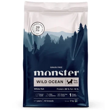 Monster Dog Grain Free Wild Ocean Sensitive är ett spannmålsfritt torrfoder för känslig hund. Hundfoder med fisk som enda proteinkälla för att minska uppkomsten av känsligheter. Innehåller vit fisk som är naturligt rik på omega 3, kombinerat med havre som skonsam glutenfri kolhydratkälla. Innehåller också mineralen natriumhexametafosfat för att minska tandstensbildning. Passar från 1 år och uppåt.
