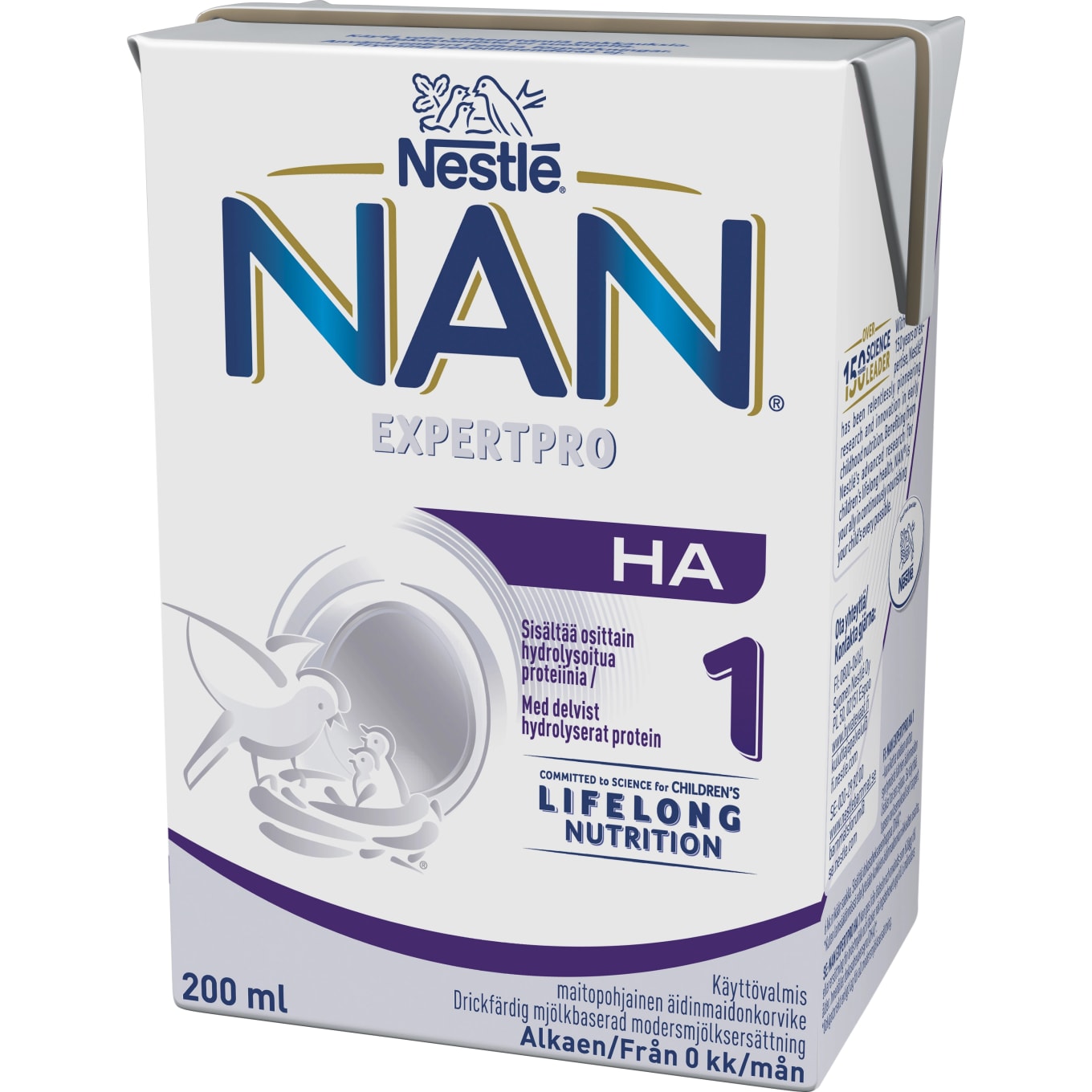 NAN Expertpro H.A. 1 är en färdigblandad modersmjölkersättning som är uteslutande baserad på mjölk. Används som komplement till eller ersättning för modersmjölk och täcker hela näringsbehovet från nyfödd bebis upp till 6 månaders ålder. NAN Expertpro HA 1 är en modersmjölksersättning där protenet delats upp i mindre bitar, där de flesta andra modersmjölksersättningar innehåller intakta komjölkproteiner. Rådgör med BVC om du behöver råd och stöd kring barnets mat. 12 x 200 ml.