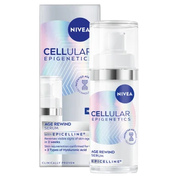 Nivea Cellular Epigenetics Age Rewind Serum är ett anti-age serum som motverkar ålderstecken. Berikad med Epicelline som påverkar cellulär ålder genom att återaktivera hudcellernas funktioner. Den innehåller även tre typer av hyaluronsyra som ger intensiv återfuktning och ökar elasticiteten i huden. Med sin effektiva formula motverkar serumet flera olika tecken på åldrande, bland annat fina linjer och ojämn hudton vilket bidrar till en hud fylligare hud med lyster.