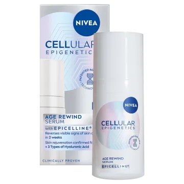 Nivea Cellular Epigenetics Age Rewind Serum är ett anti-age serum som motverkar ålderstecken. Berikad med Epicelline som påverkar cellulär ålder genom att återaktivera hudcellernas funktioner. Den innehåller även tre typer av hyaluronsyra som ger intensiv återfuktning och ökar elasticiteten i huden. Med sin effektiva formula motverkar serumet flera olika tecken på åldrande, bland annat fina linjer och ojämn hudton vilket bidrar till en hud fylligare hud med lyster.