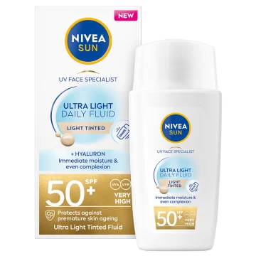 Nivea Sun UV Face Ultra Light Daily Fluid Tinted SPF 50+ är ett färgat solskydd för ansiktet som ger ett mycket högt skydd mot solens skadliga UVA- och UVB-strålar. Berikad med hyaluronsyra och antioxidanter som återfuktar, ger en uppfriskande känsla och skyddar huden mot oxidativ stress. Krämen ger en jämnare hudton med långvarig täckning och absorberas snabbt utan att kännas fet eller kladdig. Ger en matt finish med ett jämnt och naturligt resultat. Passar alla hudtyper. 40 ml.