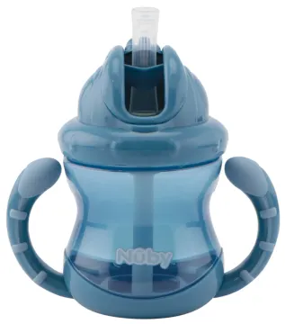 Nuby Flip It Cup Twin Handle är en sugrörsmugg med spillfri design. Muggen har ett mjukt sugrör i silikon och två greppvänliga handtag. Variflow-sugröret låter barnet själv styra vätskans flöde. När muggen inte används kan sugröret enkelt fällas ned i locket. Passar barn från 1 år. Rymmer 240 ml.