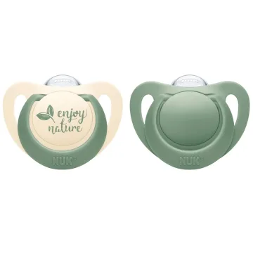 NUK for Nature Napp Silikon Green är en napp med mjuk sugdel av silikon och sköld i hållbart producerad plast. Dinappen har den ursprungliga NUK-formen som är rund upptill och platt undertill, vilket gör att nappen trycker sig mot gommen och lämnar utrymme för tungan. Ingår i NUK for Natures produktserie som är framtagen med naturen som förebild. 2-pack.