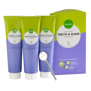 Nutrolin Teeth & Gums Paste är ett fodertillskott som bidrar till tandköttets och tändernas välmående hos hundar och katter. Fodertillskottet innehåller omega-3-fettsyror som bidrar till ett välmående tandkött, och havsalger som skyddar tänderna mot plackbildning och tandsten. Pastan har en smidig konsistens som är lätt att dosera och passar både hundar och katter. 200 g.