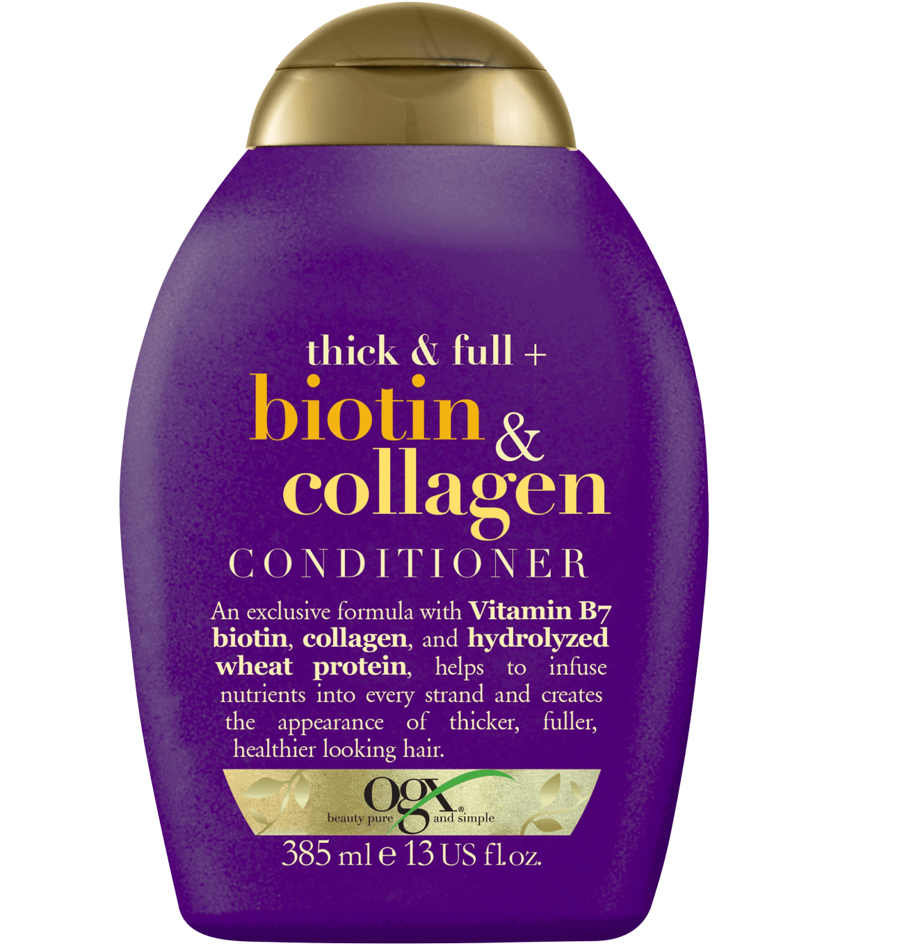 OGX Thick & Full Biotin & Collagen Condtioner är ett volymgivande balsam som ger ett märkbart fylligare hårsvall med en fin glans och lyster. Passar normalt hår, även färgat hår. Parfymerat. 385 ml.