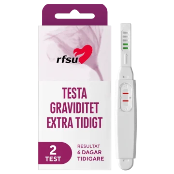 RFSU Early Tidigt Graviditetstest ger dig möjlighet att testa om du är gravid så tidigt som möjligt. Du kan göra testet redan 6 dagar innan utebliven menstruation. Det är enkelt att använda eftersom att du kan kissa direkt på testet. Du får ett tydligt resultat med ett eller två streck inom 1-5 minuter. Om testet visar ett svagt positivt resultat rekommenderas att testa igen 2 dagar senare. Testet är över 99% tillförlitligt från och med dagen du väntar din mens. Du kan testa när som helst under dygnet men säkrast är att mäta morgonurinen, då hCG-koncentrationen är som högst.
