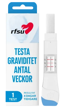 RFSU Weeks Graviditetstest Veckoindikator är ett graviditetstest med veckoindikator som visar hur många veckor du varit gravid. Du kan göra testet redan 4 dagar innan väntad mens. Testets känslighet är 25 mlU/ml av hormonet hCG i urinen. Du kan testa när som helst under dygnet men säkrast är att mäta morgonurinen, då hCG-koncentrationen är som högst. Testet är enkelt att använda och har en bred spets som gör det lättare att kissa direkt på testet. Svaret kommer inom 1-5 minuter med tydliga linjer som är lätta att läsa av. Testet har fyra olika linjer för att visa gravidveckor. 1-2 veckor 2-3 veckor 3-4 veckor 4+ veckor