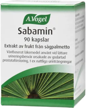 Använt vid lättare urineringsbesvär som orsakas av godartad prostatförstoring. Sabamin innehåller extrakt av frukt från sågpalmetto (Serenoa repens). Växten är ekologiskt odlad, väl beprövad och färskt extraherad.