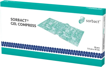 Sorbact Gel Compress är en bakteriebindande gelkompress som förebygger och behandlar sårinfektion. Kompressen består av Sorbact® bakteriebindande sårkontaktlager tillsammans med en vattenbaserad gel som avger fukt till såret och skapar en optimal miljö för sårläkning. Den unika, gröna Sorbact®-ytan binder naturligt till sig bakterier från såret som sedan följer med förbandet när det avlägsnas. På så sätt minskar antalet bakterier i såret och läkningen underlättas utan att det avges några aktiva ämnen i såret. Finns i storlekarna 7.5x7.5 cm, 7.5x15 cm och 3x15 cm. 10 st.
