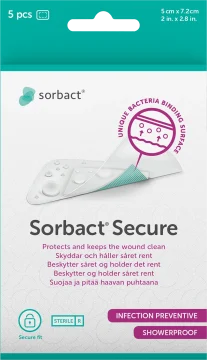 Sorbact Secure är ett plåster med en bakteriebindande yta som underlättar sårläkningen och förebygger infektion. Plåstret håller såret rent, minskar de befintliga bakterierna och skyddar mot bakterier utifrån. Självhäftande akrylfilm som är följsam över huden och vattentät samt sitter säkert vilket möjliggör lek, idrott, dusch och bad. Används vid sår och svampinfektion. Finns i storlek 5 x 7,2 cm och 8 x 10 cm. 5 st.