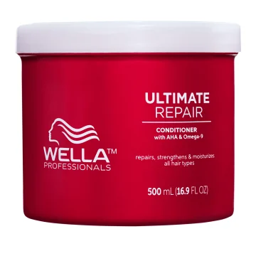 Wella Professionals Ultimate Repair Conditioner är ett vårdande och reparerande balsam för skadat hår. Berikad med AHA-syra och omega 9 som återuppbygger håret inifrån och ut. AHA stärker och vårdar både friskt och kemiskt behandlat hår genom att återuppbygga vätebindningarna och tränga in i hårfibern på djupet vilket förhindrar avbrutna hårstrån. Formulerad med Metal Purifier Technology som rengör håret från orenheter och metaller vilket motverkar skador, matthet och färgskiftningar och gör håret friskt, mjukt och glansigt