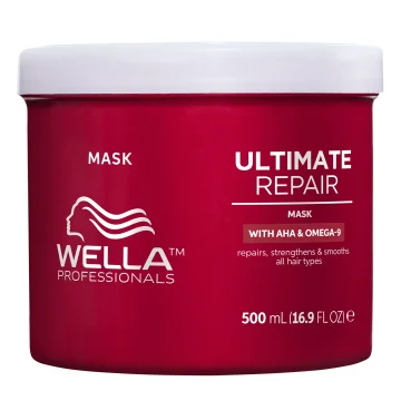 Wella Professionals Ultimate Repair Mask är en djupt vårdande hårinpackning för skadat hår som minskar frissighet och gör håret lätt att borsta ut. Den reparerar hår som skadats av UV-strålning, värmeverktyg, hårsnoddar och löshår. Berikad med AHA-syra och omega 9 som återuppbygger håret inifrån och ut. AHA stärker och vårdar både friskt och kemiskt behandlat hår genom att återuppbygga vätebindningarna och tränga in i hårfibern på djupet vilket förhindrar avbrutna hårstrån.